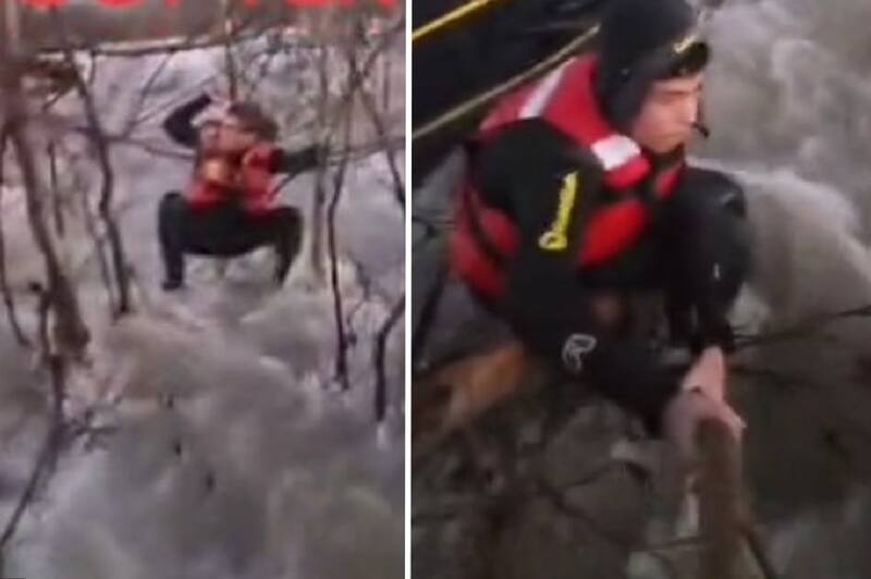 Como se aprecia en imágenes que ellos mismos grabaron, lograron sujetarse de unas ramas para no ser arrastrados por la fuerte corriente.