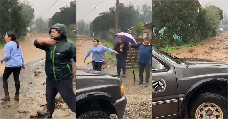 En el clip se puede ver el momento exacto en que el agua provocó un colapso de la ruta, mientras los vecinos intentaban refugiarse a un costado del camino y de paso ayudan al conductor de una camioneta para que no suceda algo peor.