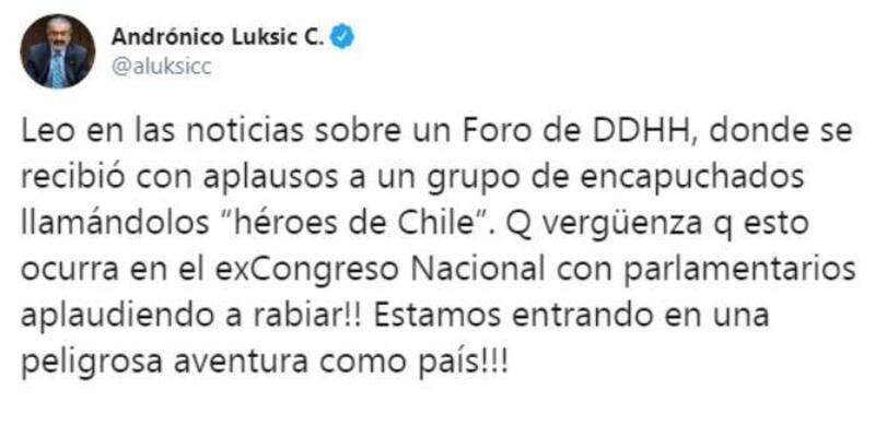 "Leo en las noticias sobre un Foro de DDHH, donde se recibió con aplausos a un grupo de encapuchados llamándolos 'héroes de Chile'. Que vergüenza que esto ocurra en el ex Congreso Nacional con parlamentarios aplaudiendo a rabiar!! Estamos entrando en una peligrosa aventura como país!!!", lamentó Luksic, que se sumó a las críticas contra el hecho.