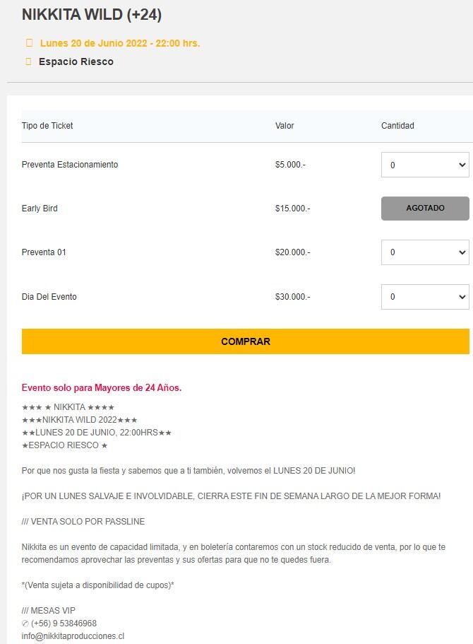 En la ticketera Passline todavía se puede leer que la fiesta es exclusiva para mayores de 24 años y que se pueden obtener mesas VIP en un teléfono y mail de la productora Nikkita.