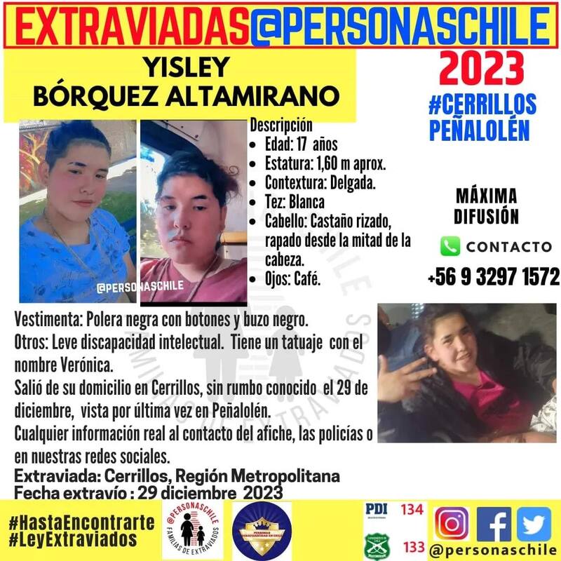 “Desaparecida: su nombre es Yisley Bórquez, está desaparecida desde el 29 de diciembre. Salió desde casa con rumbo desconocido. La última vez que la vieron fue en Peñalolén, desorientada. Ella tiene retraso mental leve pero puede estar pérdida”.