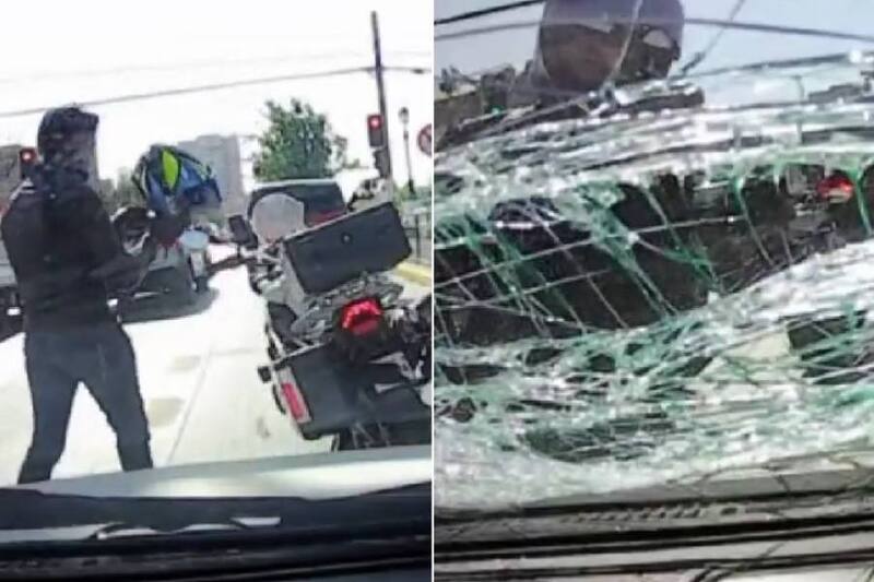 De forma irracional, procedió a romper el parabrisas del auto con una cadena que transportaba en su moto.