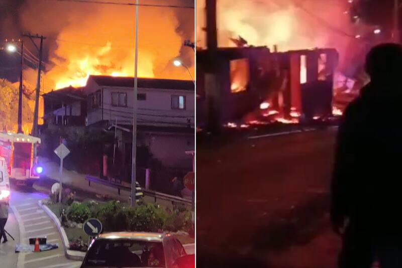 Siete casas destruidas dejó un voraz incendio que avanzaba sin control, la noche de este sábado, en el centro de la comuna de Tomé, en la Provincia de Concepción.