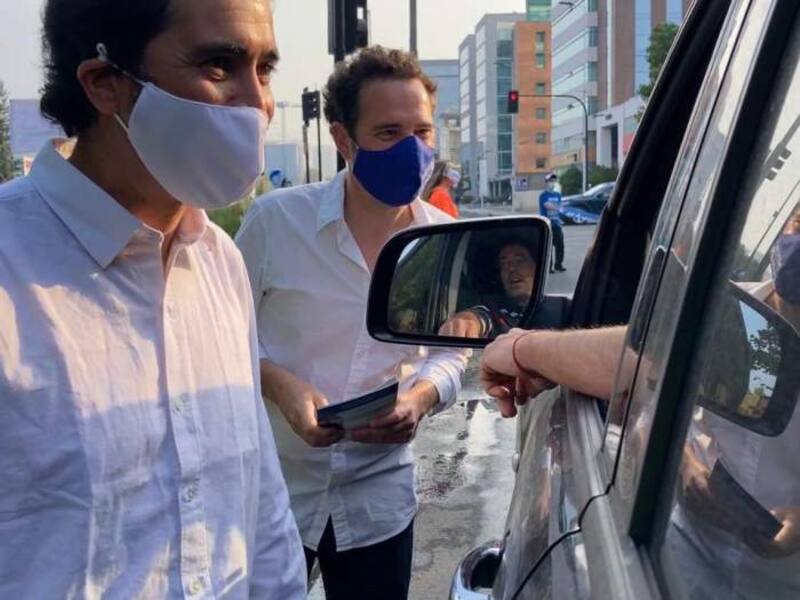 Recién había amanecido en la capital y cientos de vehículos se dirigían a sus lugares de trabajo en el sector oriente de la ciudad. En la esquina de Estoril con Avenida Las Condes, los automovilistas —si andaban de ánimo— podían hacer una pausa en su rutina y hablar con Ignacio Briones y Hernán Larraín (hijo), ambos postulantes en distintos cargos; el primer es precandidato presidencial y, el segundo, busca ser uno de los 155 constituyentes.