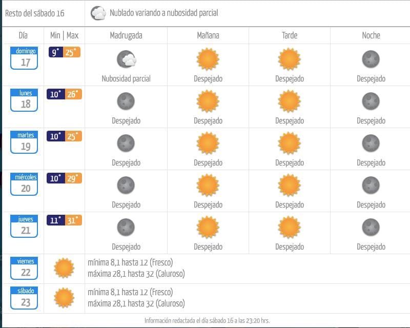 Y en ese contexto, de acuerdo a la Dirección Meteorológica se espera una jornada similar a la del sábado, donde las temperaturas oscilarán entre una mínima de 9º y una máxima que sólo alcanzaría los 25º.