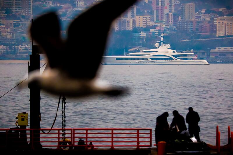 Ostentoso barco ruso recaló en Valpo el 6 de mayo y debido a la pandemia no pudo zarpar. Su propietario es Dimitry Rybolovlev, dueño del equipo de fútbol AS Mónaco, y cuya fortuna se estima en más de 7 billones de dólares.