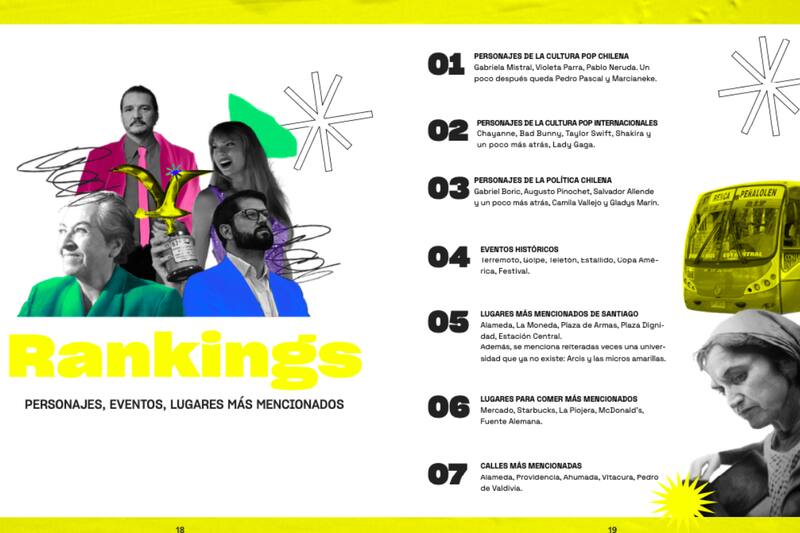 En el ranking señalaron que los personajes de la cultura pop nacional que más aparecen: Pablo Neruda, Violeta Parra y Pablo Neruda son los nombres que más se repiten, también se observan los nombres de Marcianeke y Pedro Pascal. También hay presencia del mundo político, ya que aparece Gabriel Boric, Augusto Pinochet, Salvador Allende, Gladys Marín y Camila Vallejo.