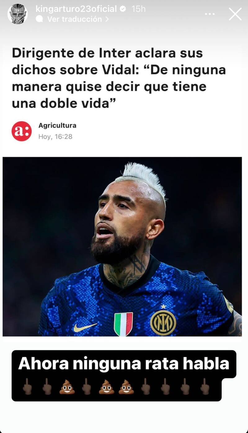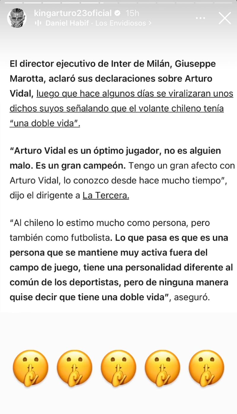 Eso sí, tras dicha aclaración, Vidal compartió la noticia y compartió un furioso mensaje a través de sus redes sociales, donde arremetió e hizo callar a quienes festinaron con las declaraciones iniciales de Marotta.