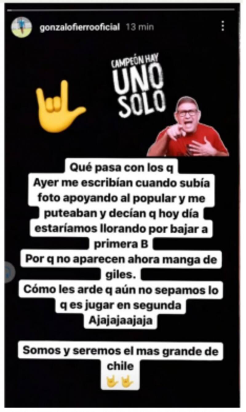 "¿Qué pasa con los que ayer me escribían cuando subía fotos apoyando al popular y me puteaban y decían que estaríamos llorando por bajar a Primera B?. ¿Por qué no aparecen ahora, manga de giles?. Cómo les arde que aún no sepamos lo que es jugar en segunda. Somos y seremos el más grande de Chile". escribió furia el ex Flamengo de Brasil en sus historias de Instagram.