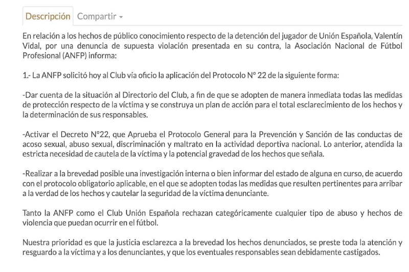 Con todo ese contexto, esta jornada desde la ANFP también reaccionaron y publicaron un comunicado en el que se refirieron al tema. Por ejemplo, instó al conjunto hispano a “dar cuenta de la situación al Directorio del Club, a fin de que se adopten de manera inmediata todas las medidas de protección respecto de la víctima y se construya un plan de acción para el total esclarecimiento de los hechos y la determinación de sus responsables”.