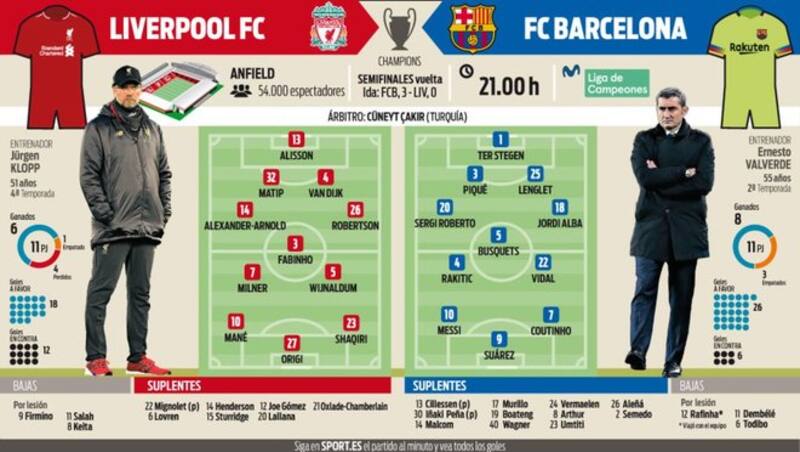 El panorama se ve complicado para los ingleses, que estarán sin Firminho ni "Mo" Salah. Pese a esto, Jürgen Klopp saltarán con su mejor gente para buscar la heroica remontada en Anfield Road.