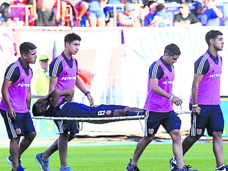 La víctima fue Augusto Barrios, pues tras el pitazo inicial el volante de Universidad de Chile corrió para pelear el balón al borde de su área, y al momento de trancar, su pierna izquierda quedó trabada en el césped del Nacional.