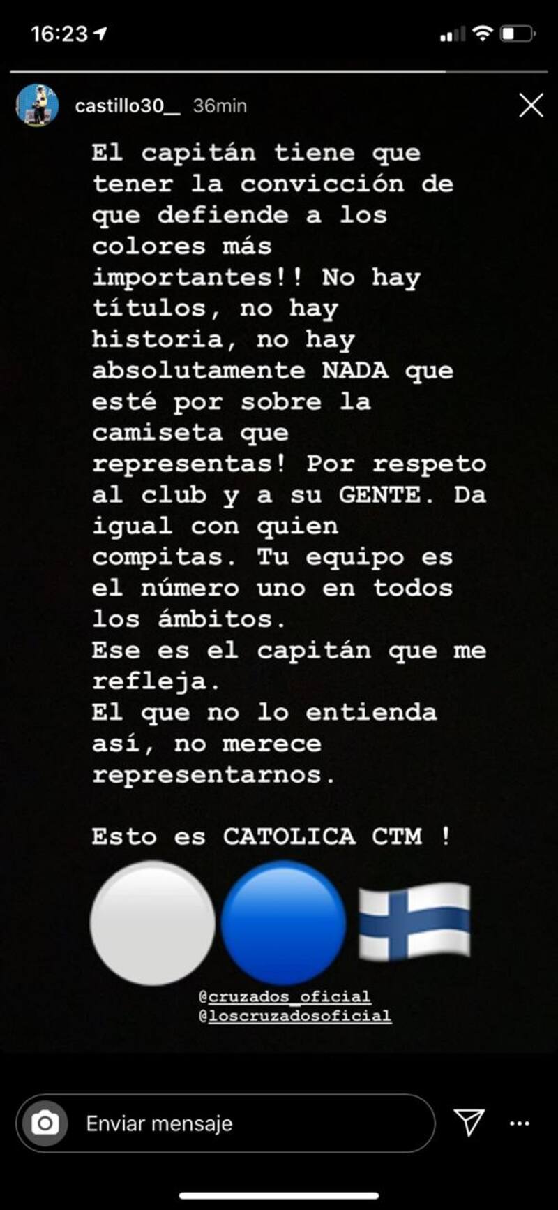 En su Instagram, el bicampeón con la UC destrozó al "Cafú de Los Trapenses" indicando que "el capitán tiene que tener la convicción de que defiende a los colores más importantes. No hay títulos, no hay historia, no hay absolutamente nada que esté por sobre la camiseta que representas", escribió.