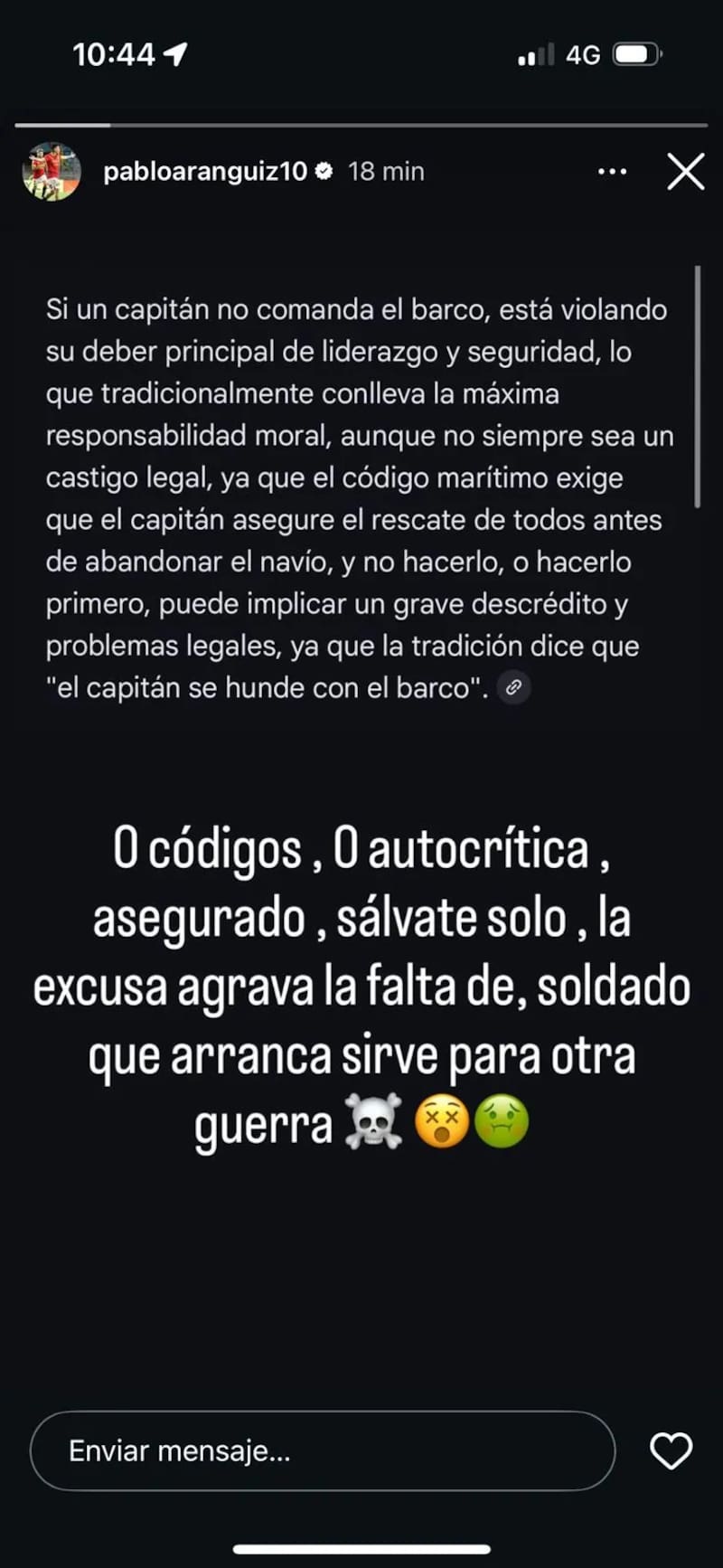 Por si hiciera falta, abajo, por las suyas, Aránguiz agregó: “Cero códigos, cero autocrítica, asegurado, sálvate solo”.