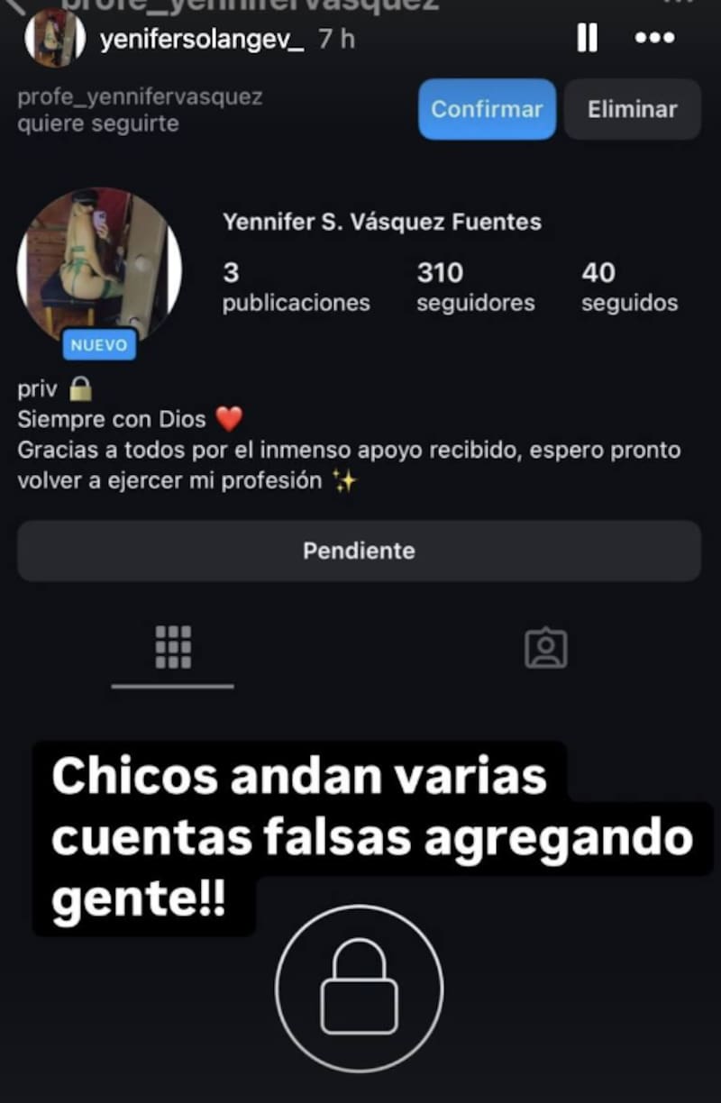 La profesora Yennifer Vásquez denunció este lunes que hay varias cuentas falsas rondando en Instagram, con algunas de las fotos suyas que se filtraron de su antigua cuenta en Arsmate, haciendo un llamado a evitar engaños.