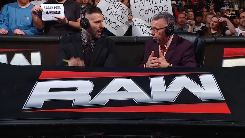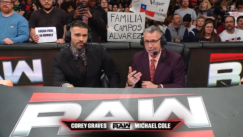 Mientras los comentaristas Corey Graves y Michael Cole tenían una intervención y eran enfocados en cámara, detrás de estos salían los mensajes “en chileno”.