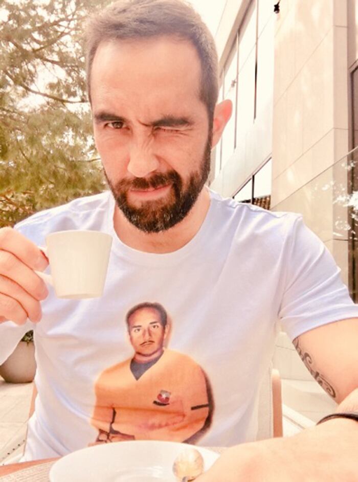 A mitad semana, publicó una foto tomando café y vistiendo una polera muy particular: la del arquero de la selección en el Mundial del 62', Misael Escuti.