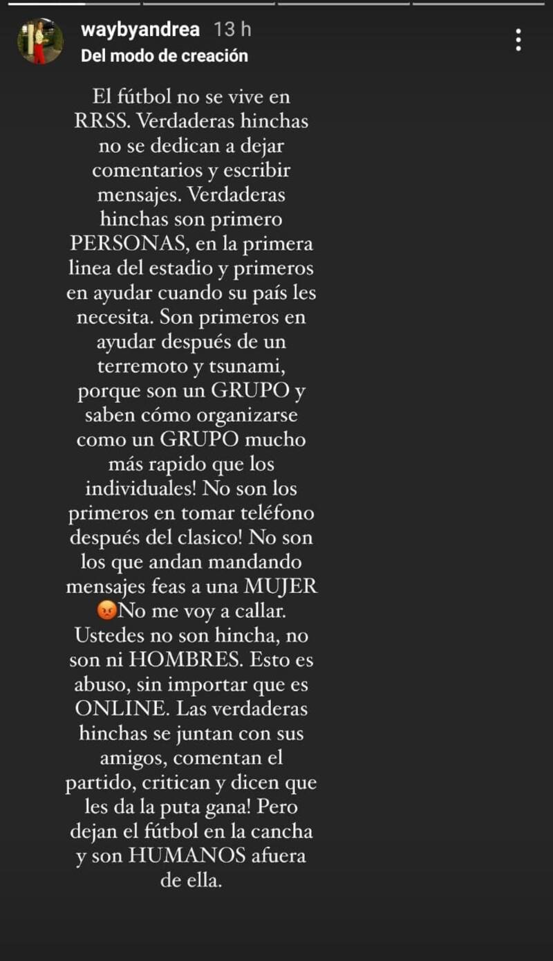 "No son los primeros en tomar el teléfono después del clásico. No son los que mandan mensajes feos a una mujer. No me voy a callar. Ustedes no son hinchas, no son ni hombres. Esto es abuso, sin importar que es online. Los verdaderos hinchas se juntan con amigos, comentan el partido, critican y dicen lo que les da la puta gana, pero dejan el fútbol en la cancha y son humanos afuera de ella", las cantó clarita la ingeniera civil, quien luego recibiría apoyo.