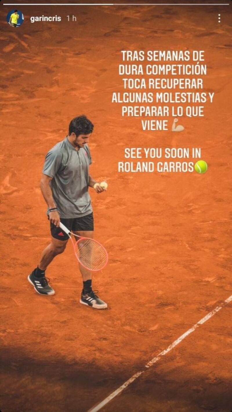 "Tras semanas de dura competición, toca recuperar algunas molestias y preparar lo que viene. Nos vemos pronto en Roland Garros!", indicó Garín en su red social.