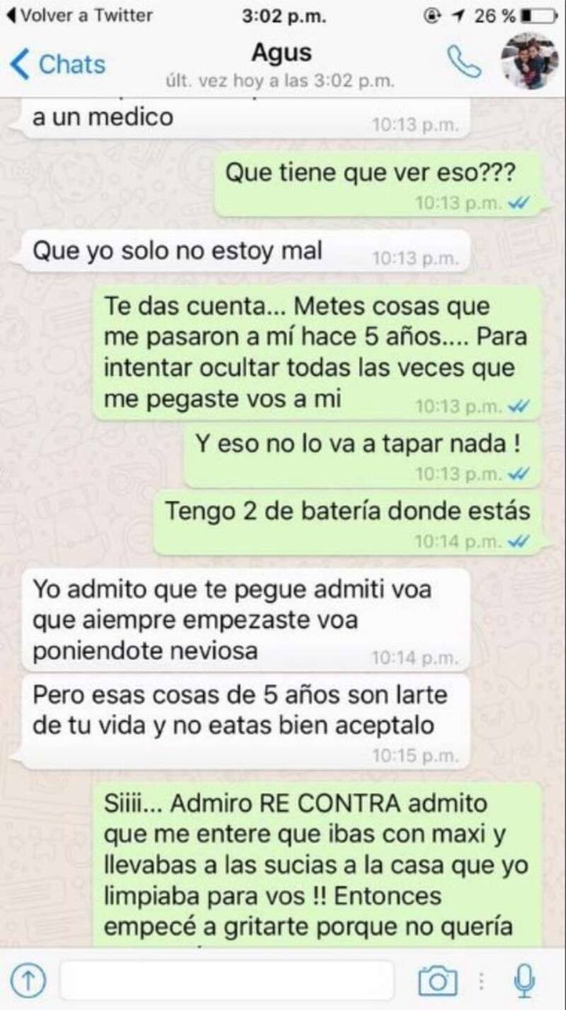 La cosa no quedó ahí, ya que la joven también publicó pantallazo de los chats que mantuvo con el jugador por los constantes comentarios en su contra, de parte de los hinchas de Boca. "Yo admito que te pegué, admití vos que siempre empezaste vos poniéndote nerviosa. Pero esas cosas de cinco años son parte de su vida y no estás bien, aceptalo", le respondió el futbolista por Whatsapp agigantando la polémica.