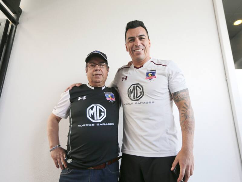 "He recibido muchos regalos y esto yo lo hice para que mi familia y mis amigos me llamaran así. Nunca pensé que se iba a viralizar y ahora, en vez de estar en mi casa, estoy aquí sacándome fotos con los jugadores", se emocionó don Colo-Colo.