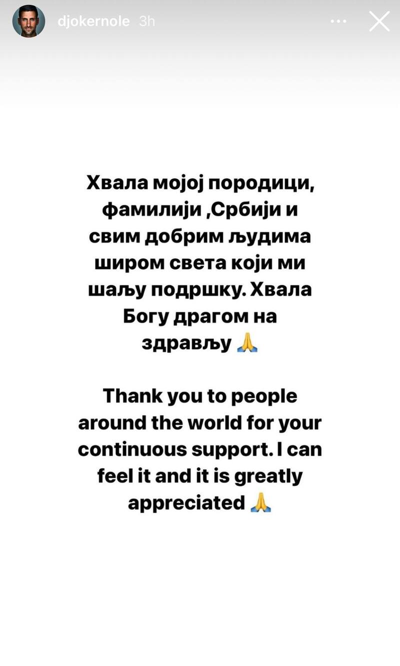 “Gracias a mi familia, a mis amigos, a Serbia, y a toda la gente buena alrededor del mundo que me envía su apoyo. Gracias a Dios por la salud”, escribió en la plataforma virtual.