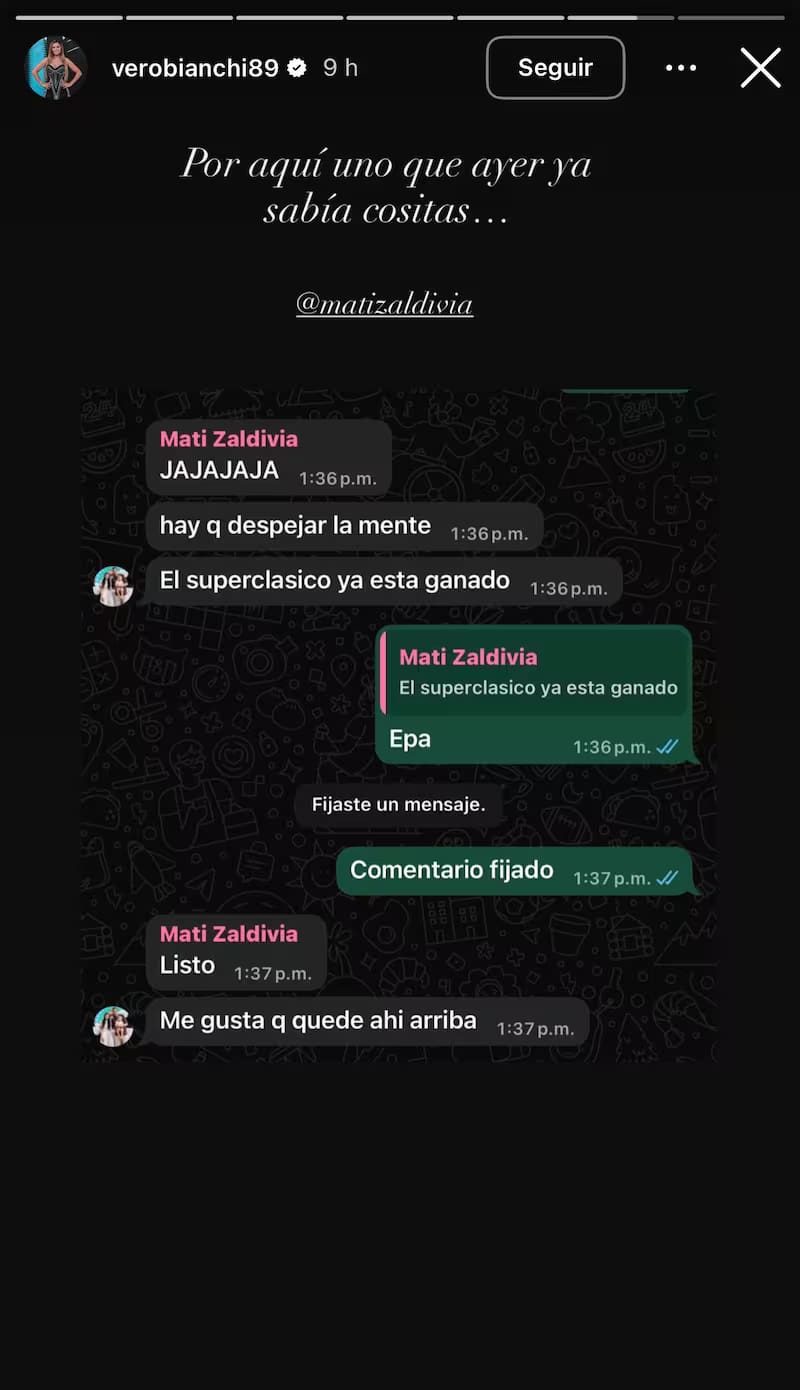Verónica Bianchi, periodista de TNT Sports y amiga del zaguero, aportó otra prueba. También mediante Instagram publicó un intercambio en donde Zaldivia le aseguraba que “el superclásico ya está ganado”.