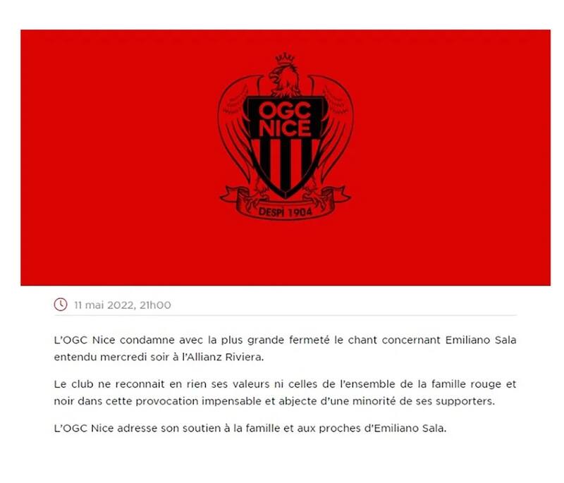 El club más tarde debió pedir disculpas por el comportamiento de su hincha y, a través de un comunicado, se disculparon con la familia de Sala. Lo propio hicieron algunos de sus jugadores, como Andy Delort, que dejó un mensaje en Twitter.