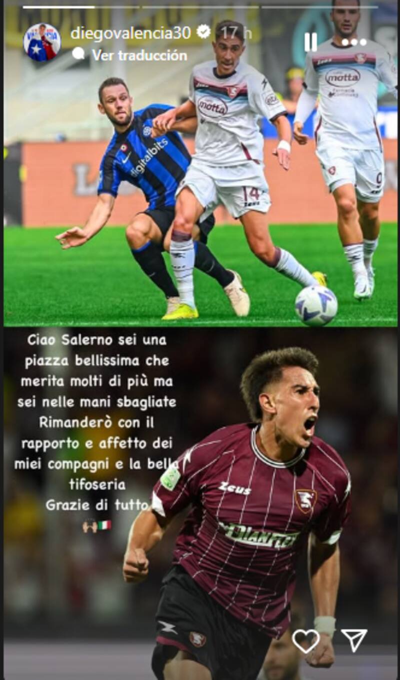 Luego de oficializar su retorno a la Cato, Valencia usó sus redes sociales para despedirse de la hinchada del Salernitana, donde además aprovechó de arremeter en contra de la dirigencia del club y sus administradores.