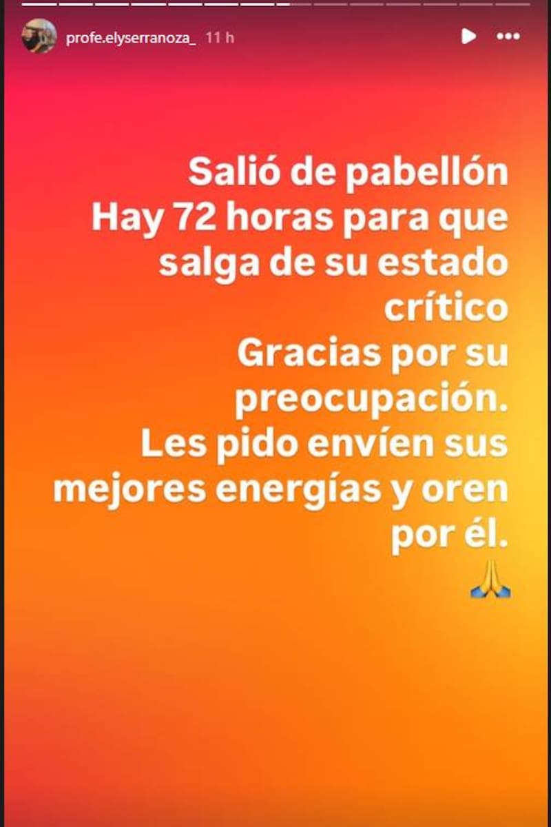Y pese a que recibió la atención oportununa, su estado sigue siendo de cuidado. Así lo dio a conocer su esposa, Ely Serrano, quien llamó a pedir por él y aseguró que las próximas 72 horas serán claves para salir del “estado crítico”.