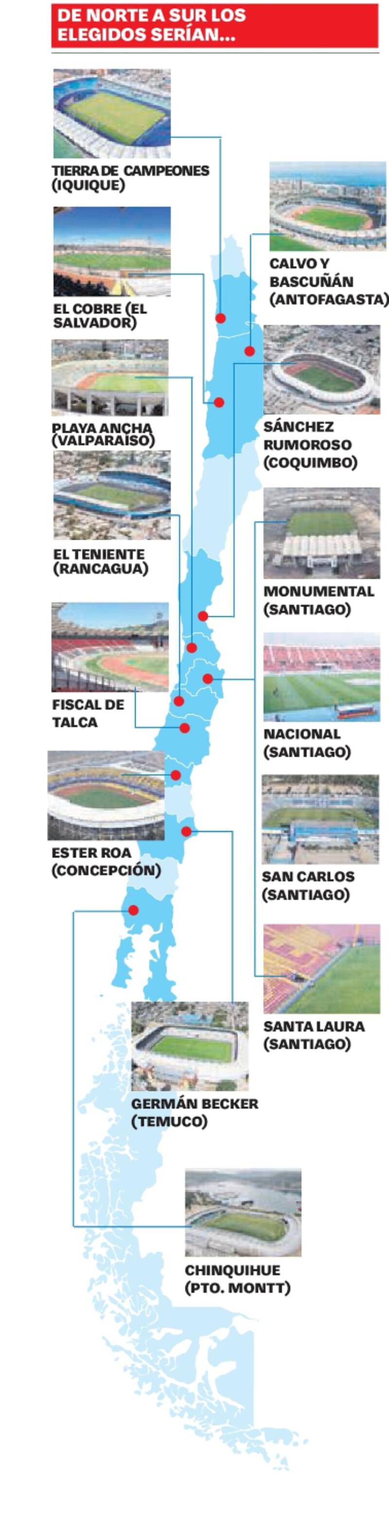 Playa Ancha será la casa de los de la Quinta Región, aunque se podría sumar Sausalito. En Santiago, San Carlos de Apoquindo, Nacional, Monumental y Santa Laura (que sólo debe solucionar un tema con la dimensión de los camarines) tendrán la preferencia, en desmedro de La Cisterna y La Florida, que al ser recintos municipales, generan problemas en la logística.