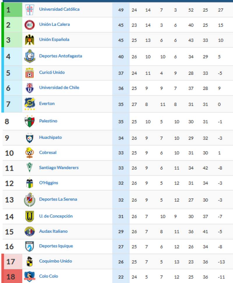 Esto porque ahora los de la quinta región alcanzaron 35 unidades y quedaron en el séptimo puesto. En tanto Iquique queda en la 16ª posición con 27 unidades. Además en la ponderada se mantiene como colista con 1,032.