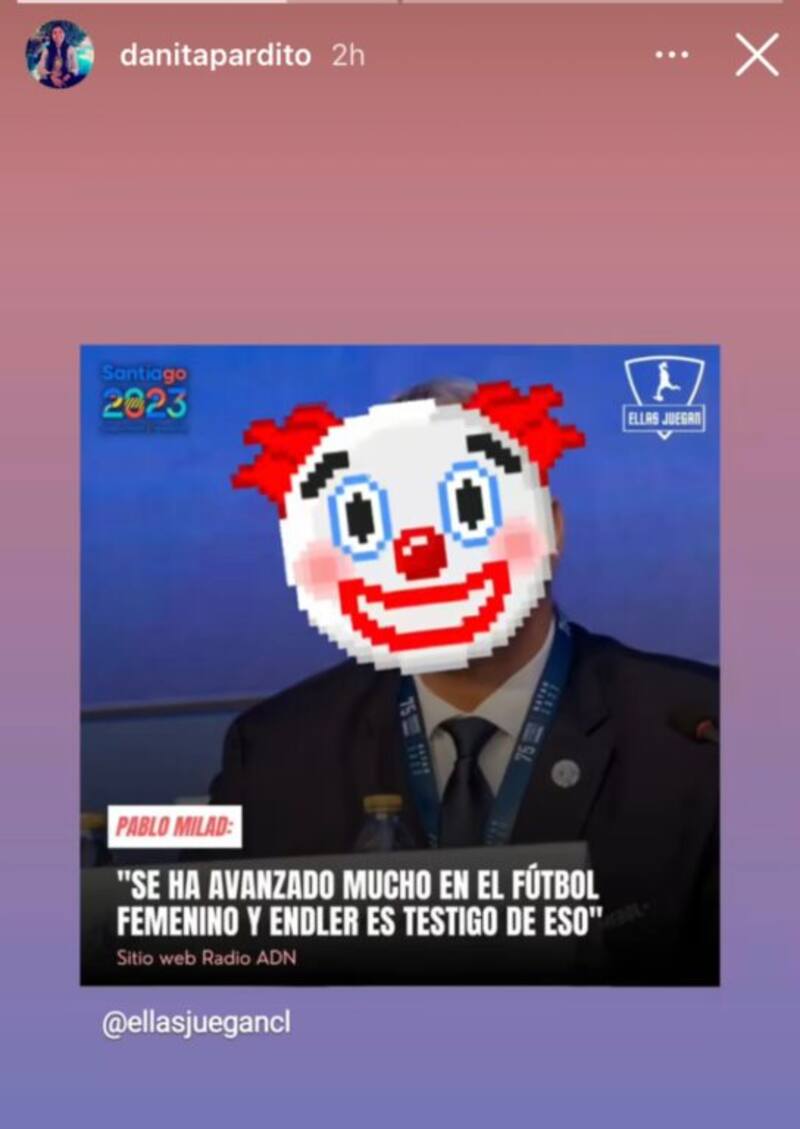 Sus declaraciones le valieron para que la deportista editara una fotografía del mandamás del ente rector del fútbol chileno para dejarlo como payaso. La imágen fue compartida a través de sus historias de Instagram, pero no fue el único contra el que apuntó.