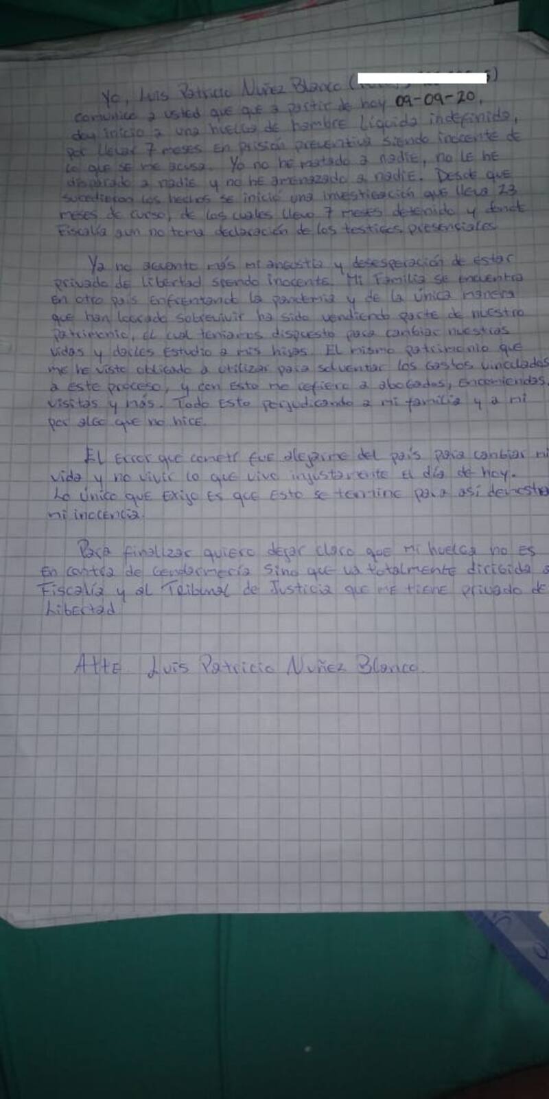 Además, agregó: "Yo no aguanto más mi angustia y desesperación de estar privado de libertad siendo inocente. Mi familia se encuentra en otro país enfrentando la pandemia y de la única manera que han logrado sobrevivir ha sido vendiendo parte de nuestro patrimonio, el cual teníamos dispuesto para cambiar nuestras vidas y darles estudios a mis hijas. El mismo patrimonio que me he visto obligado a utilizar para solucionar los gastos vinculados a este proceso, y con esto me refiero a abogados, encomiendas, visitas y más. Todo esto perjudicando a mi familia y a mí por algo que no hice".