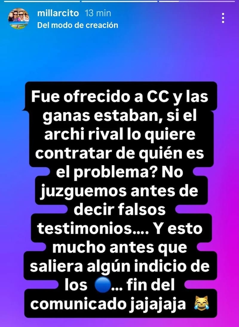 “Fue ofrecido a Colo Colo y las ganas estaban, si el archirrival lo quiere contratar ¿de quién es el problema? No juzguemos antes de decir falsos testimonios”, lanzó en su Instagram.