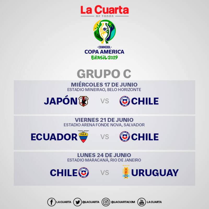 La Roja en esta ocasión quedó ubicada en el grupo C junto a Uruguay, Ecuador y Japón. Justamente Chile iniciará su presentación ante la selección nipona el lunes 17 de junio en el estadio Morumbi de Sao Paulo.