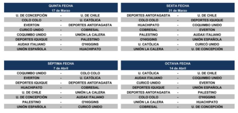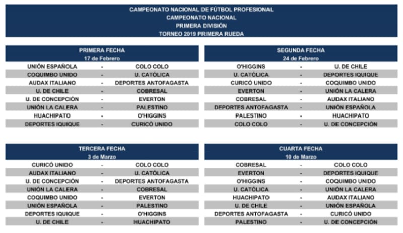 La ANFP oficializó el calendario de la primera rueda del campeonato chileno. El Superclásico se mantiene en la semana del 18 y 19 de mayo.