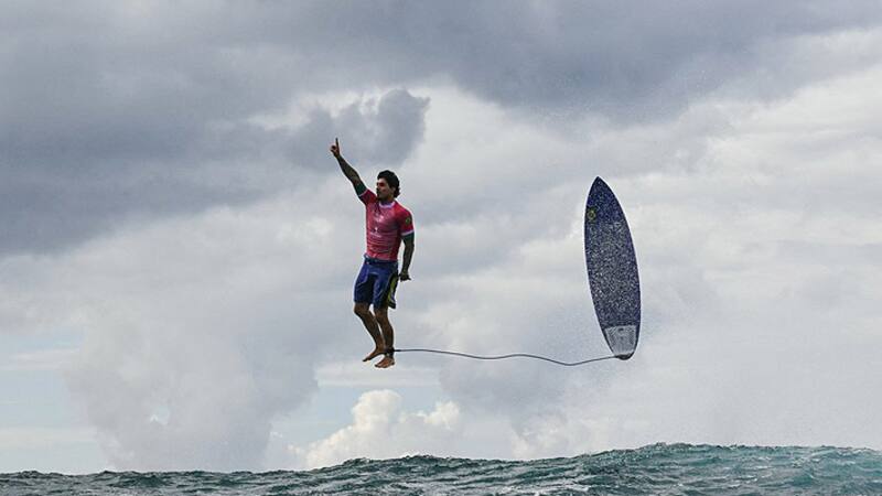 En el registro, Medina -que pasó a los cuartos de final de la competencia- se ve sobre el oleaje con un dedo apuntando el cielo y su tabla de surf al lado, como si estuvieran suspendidos en el aire.