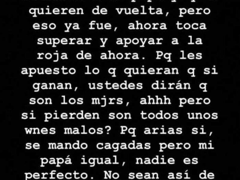 Eso sí, su mensaje fue más duro, pues la "Jo" pidió frenar las críticas con el colega de su papá. "Les apuesto lo que quieran que si ganan, ustedes dirán que son los mejores, ah pero si pierden son todos unos weones malos? Porque Gabriel Arias sí, se mandó cagadas pero mi papá igual, nadie es perfecto. No sean así de chaqueteros porfa", cerró.