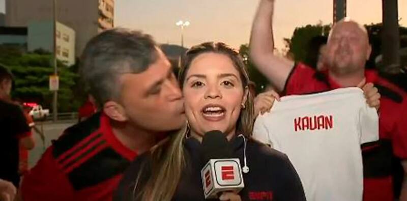 Ocurrió en medio de un despacho en vivo para la cadena ESPN, cuando la periodista Jéssica Dias entregaba las últimas informaciones acerca del Mengão. Entonces, este hincha se acercó y antes de que ella pudiera dar el pase al estudio, la besó sin su consentimiento. Las imágenes rápidamente se viralizaron y generaron toda clase de reproches en las redes sociales.