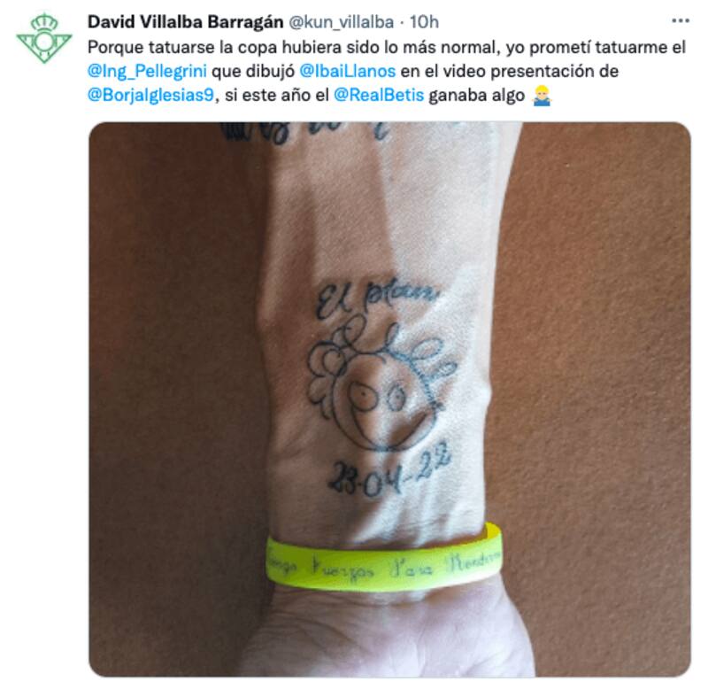 “Porque tatuarse la Copa (del Rey) hubiera sido lo más normal, yo prometí tatuarme el Manuel Pellegrini que dibujó Ibai Llanos en el video presentación (renovación) de Borja Iglesias si este año el Betis ganaba algo”, explicó su decisión David Villalba, el fanático del cuadro andaluz.