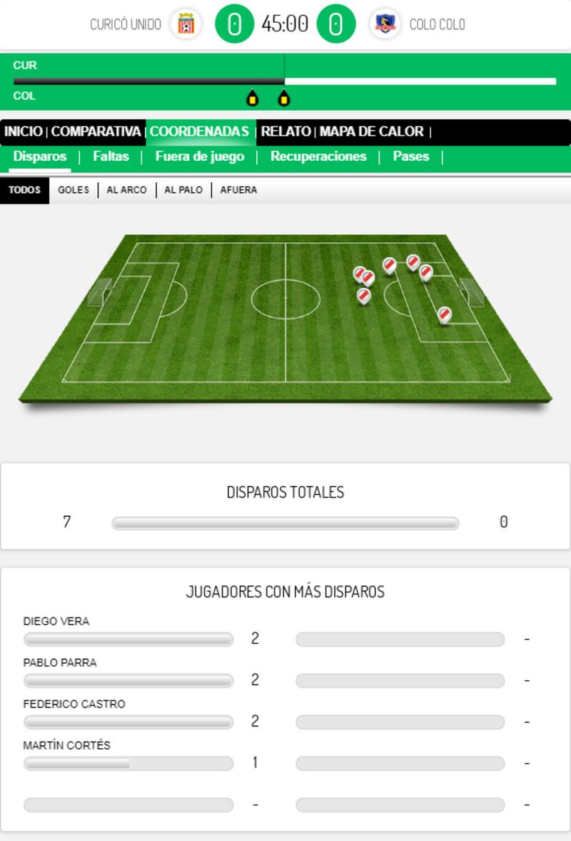 Según consignó Data Factory, Colo Colo tuvo cero disparos al arco en la etapa inicial. En tanto Curicó alcanzó siete situaciones en el arco de Brayán Cortés. Dato no menor que provocó la molestia de los garreros. Los que ya pierde la paciencia con el estratega. Esto pensando en el paupérrimo rendimiento en el torneo local y que próximamente debutará en Copa Libertadores.