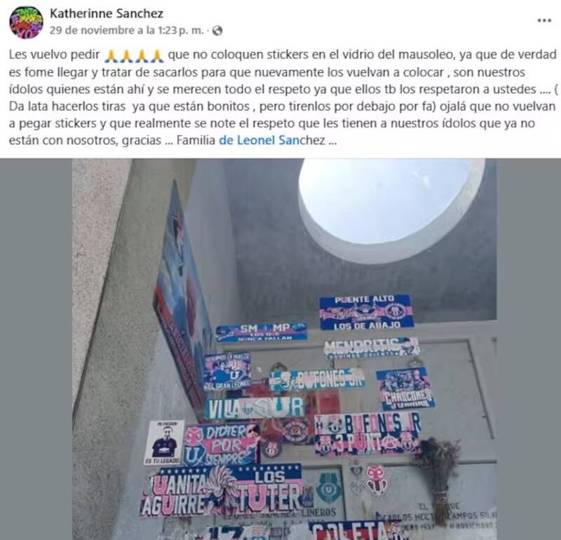 A través de un mensaje en su página de Facebook, Katherinne Sánchez solicitó que los hinchas no sigan pegando stickers en el mausoleo que resguarda sus restos junto a los de varias estrellas del denominado Ballet Azul, incluyendo a jugadores como Carlos Campos.