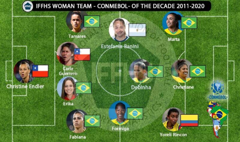El equipo ideal Conmebol de la década, entonces, quedó conformado de la siguiente manera: Endler (Chile); Fabiana, Erika, Tamares (Brasil) y Guerrero (Chile); En la mitad de la cancha están Formiga, Debinha (Brasil) y Estefanía Banini (Argentina), para dejar en la delantera a Marta, Christiane (Brasil) y Yoreli Rincón (Colombia).