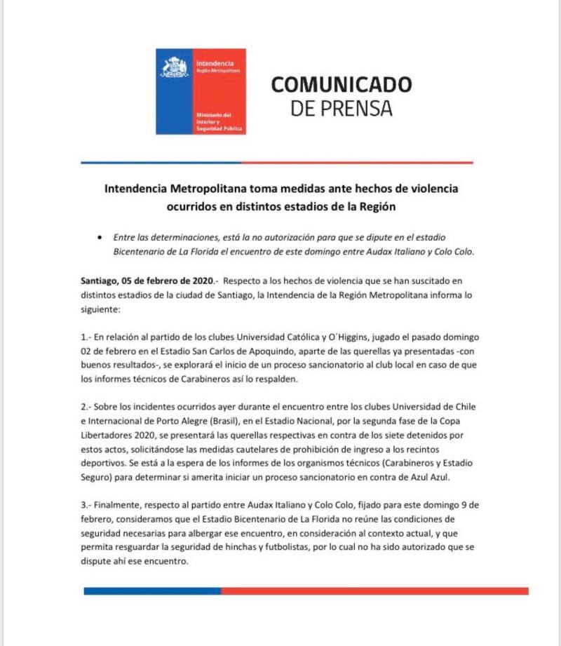 Esta mañana la Intendencia Metropolitana confirmó que el duelo entre Audax Italiano y Colo Colo no se podrá jugar en el Estadio Bicentenario La Florida. Partido pactado por la tercera fecha del campeonato nacional.