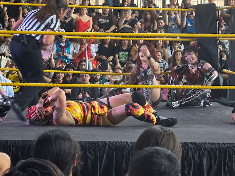 La pelea por el campeonato tuvo de todo: dominación japonesa, momentos en los que las chilenas nos hicieron creer en la victoria, hasta un dive desde el escenario de Maki Itoh, y finalmente la dura patada de Miyu que selló el 1, 2, 3 para Japón.