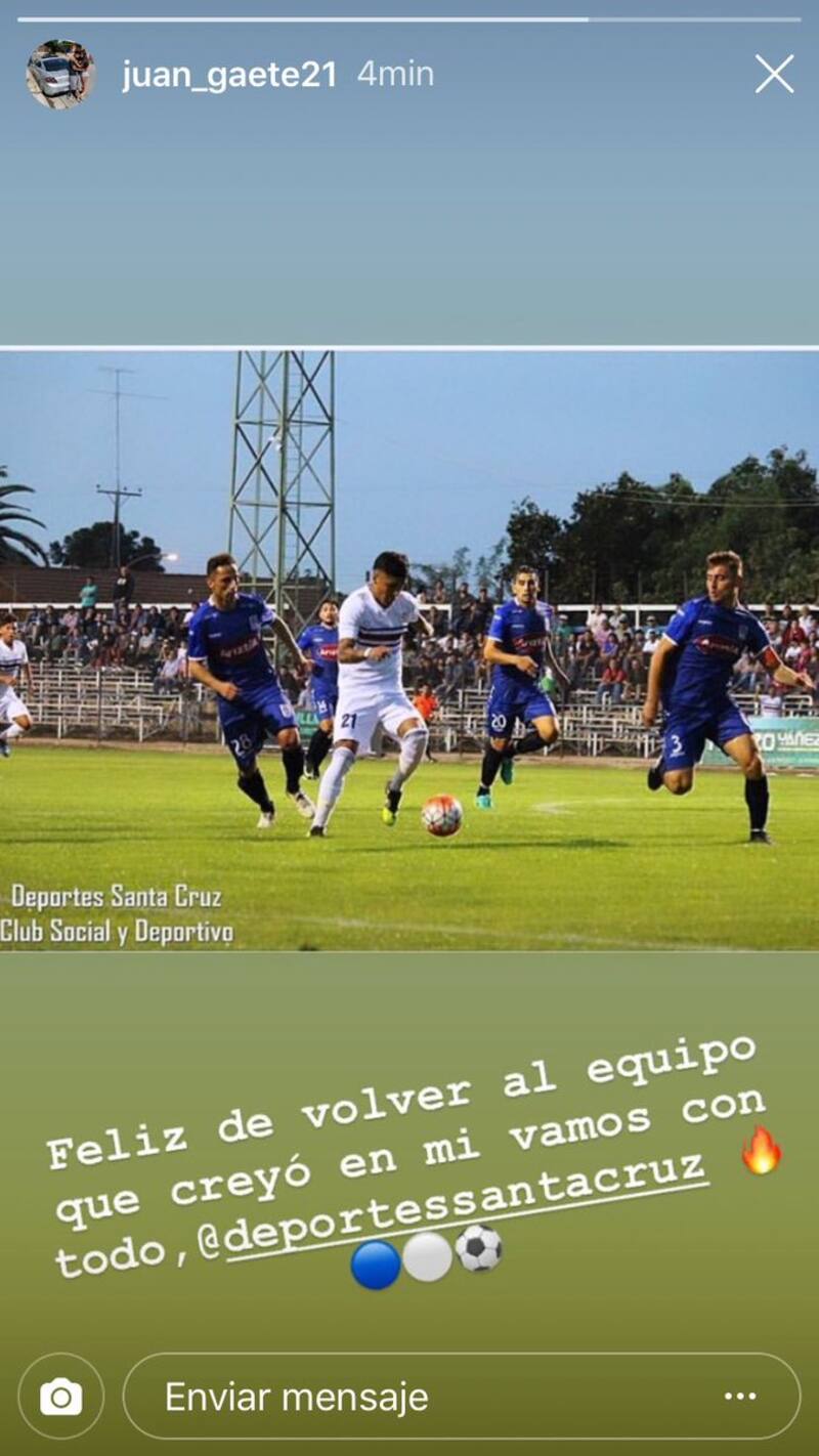 Incertidumbre que acabó hoy ya que el mismo jugador publicó en su instagram que defenderá la camiseta de Deportes Santa Cruz este 2019. "Feliz por volver al equipo que creyó en mí", agregó en una historia.