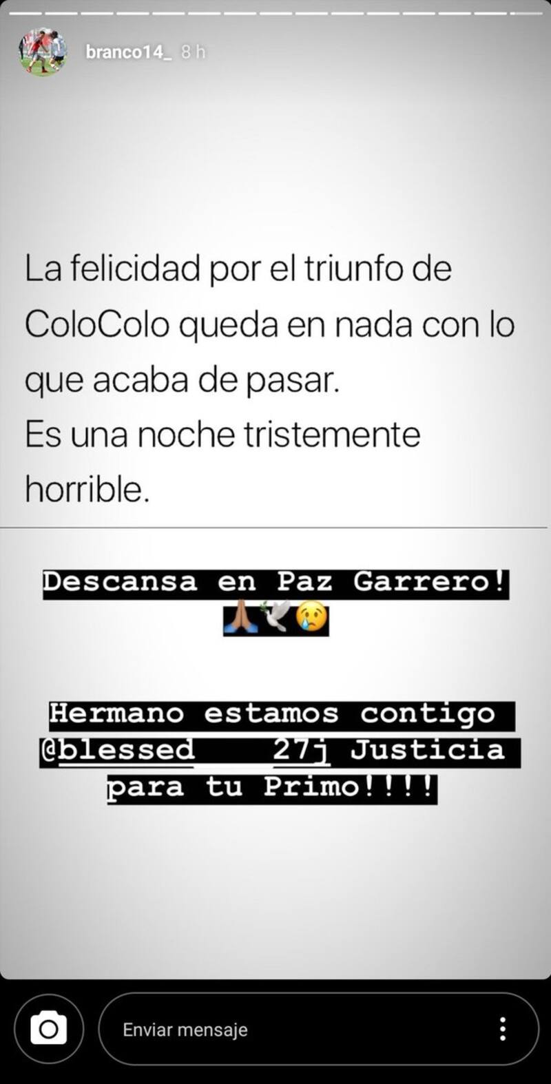 El primero en sacar la voz fue Nicolás Maturana. "Qué pena y rabia pensar que no podemos hacer nada, porque si hacemos algo en contra de ellos nos vamos presos, pero ellos pueden hacer lo que quieran. No hay justicia para el pueblo y por eso hacen lo que quieren", lanzo fuerte y claro el volante quien también envió sus condolencias a la familia afectada.