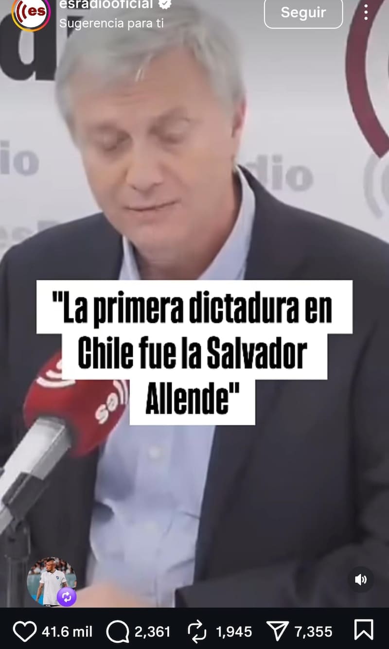 “La primera dictadura, y que da origen al gobierno militar, es la de Salvador Allende. Y eso a mí me gusta aclararlo en Europa, porque siempre hay una mirada tergiversada de nuestra historia”, se oye decir al republicano a un medio español.