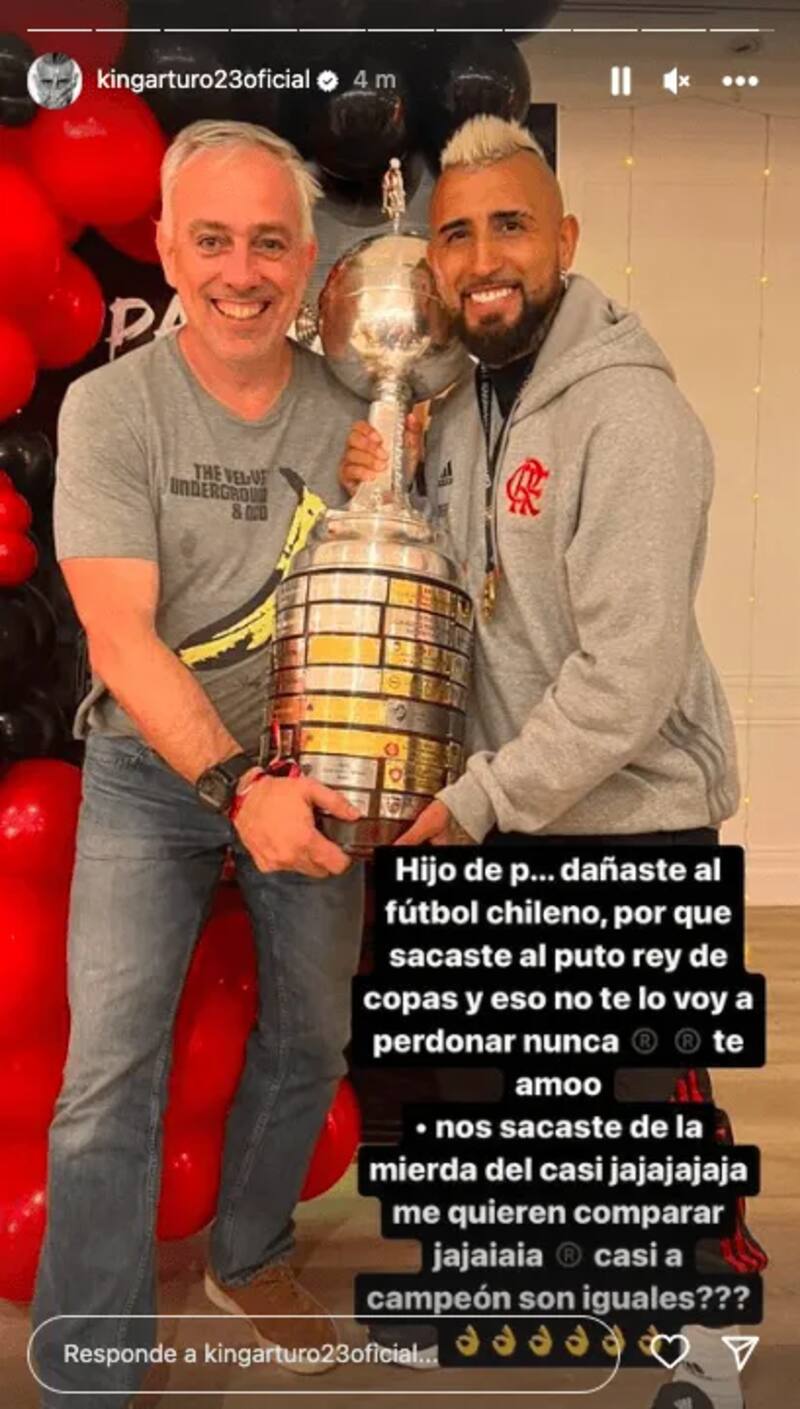 “Hijo de p... dañaste al fútbol chileno, porque sacaste al puto rey de copas y eso no te lo voy a perdonar nunca. Te amo. Nos sacaste de la mierda del casi. Me quieren comparar jajajaja. ¿Casi a campeón son iguales?”, fueron las palabras del “Rey Arturo”.